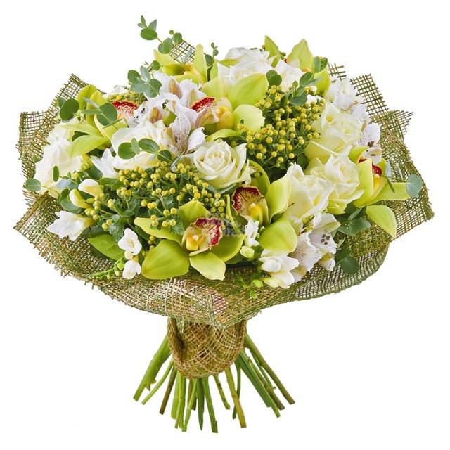 Букет состоит из нескольких разный видов цветов, смысл которых отличается и создает гармоничную смесь символов. Орхидея отвечает за нежность и утонченность. Белая роза за непорочность, чистоту и светлость. Альстромерии – это удивительная комбинация силы и хрупкости. Обрадовать букетом можно как членов семьи, так и друзей, принося извинения или в качестве приятного жеста.